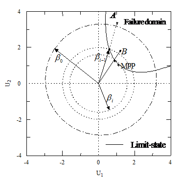 次迭代的超球外的失效樣本點(diǎn),如圖4.1中的A、B點(diǎn),分別求其概率密度函數(shù),選取其中概率密度函數(shù)最大的樣本點(diǎn),在其與坐標(biāo)原點(diǎn)的連線方向上進(jìn)行線性搜索,由于是內(nèi)插搜索,因此一般經(jīng)過(guò)2到3次搜索,即可確定該連線與極限狀態(tài)的近似交點(diǎn),交點(diǎn)到原點(diǎn)的距離即為新的超球半徑
